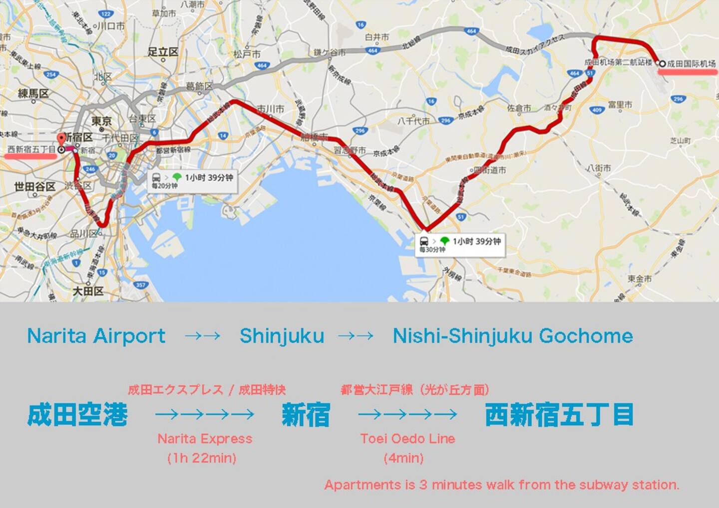 ✈️从羽田机场出发,乘坐京急机场线至「大门」换乘1次,约50分钟左右可达房源;从成田机场出发,换乘2回,90分钟左右可达。