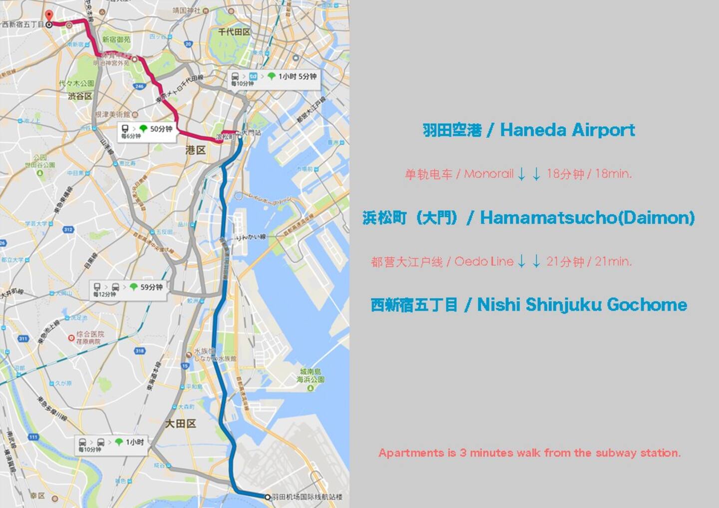🚌周围地铁公交丰富,徒步至「西新宿五丁目站」,4分钟,可乘坐都营大江户线,两站直达新宿。徒步至「中野坂上站」,11分钟,可乘「坐丸之内线」,和「都营大江户线」,徒步至公交站台3分钟,乘公交20分钟直达涩谷站。
